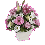 A bright ceramic pot arrangement of spray roses, lillies and gerberas.