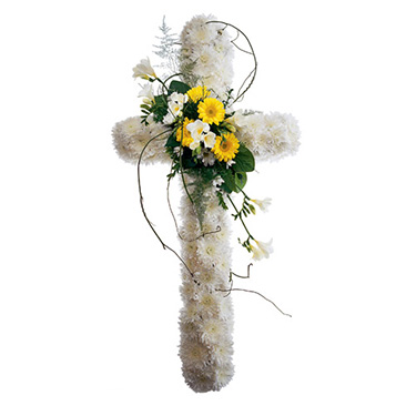 A sympathy cross with a beautiful spray of flowers. A fitting tribute to any loved one.