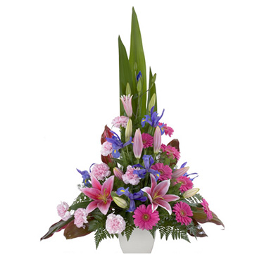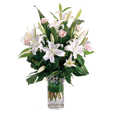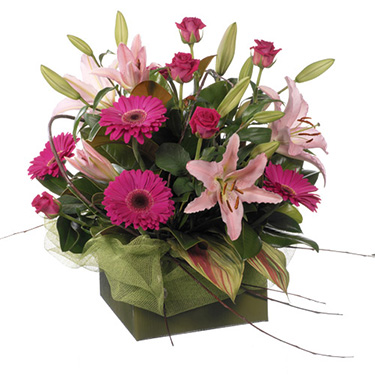 A lavish box arrangement with oriental lillies, roses and gerberas.