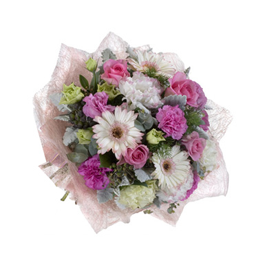 A wonderful selection of pink and pastel flowers arranged in a bouquet.