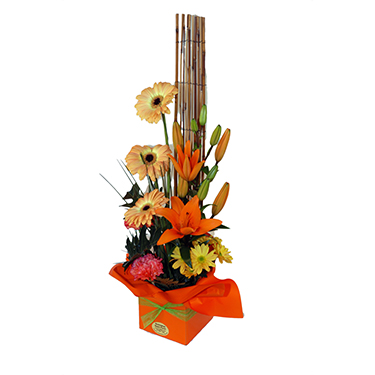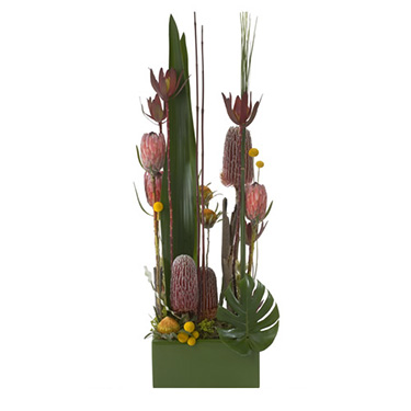 A modern designer arrangement of wildflowers in a ceramic pot.