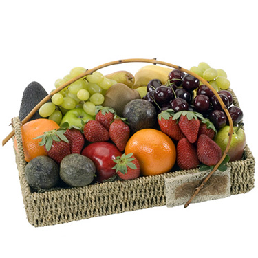 A lucious selection of seasonal fruit elegantly presented in a basket.