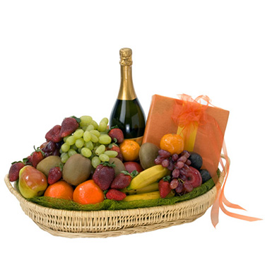 A basket of lucious seasonal fruits sparkling wine and chocolates.