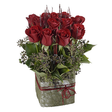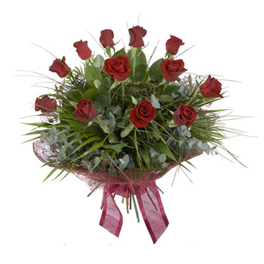 A bouqet of 12x 50cm red roses. Why not add a vase to complete this gift?
