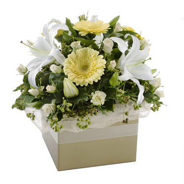 Truley elegant box arrangement of orientals, roses and gerberas.